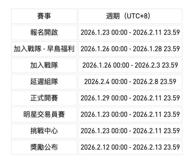 在 2026.1.26 0:00 - 2026.1.29 00:00(UTC+8)期間加入戰隊成功組隊且股票合約交易額 ≥ 10,000 USDT 的前 10,000 名用戶,將獲得 20 USDT 體驗金。