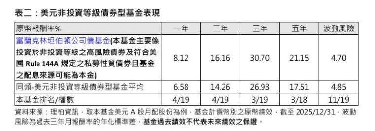 富蘭克林坦伯頓公司債基金 (本基金主要係投資於非投資等級之高風險債券及符合美國 Rule 144A 規定之私募性質債券且基金之配息來源可能為本金) 經理人葛倫 ‧ 華勒表示,美國景氣動能強勁、資本市場韌性強、勞動市場趨於穩定以及通膨壓力仍高,預期聯準會 2026 年最多僅會降息一次或甚至可能不降息。除非勞動市場進一步惡化,才有可能擴大降息空間。公司債市可受惠於如此有利的經濟環境,預估 2026 年違約風險仍偏低,然而利差處於低檔,因此須採取主動管理、聚焦具有債信品質和評價優勢的公司債。