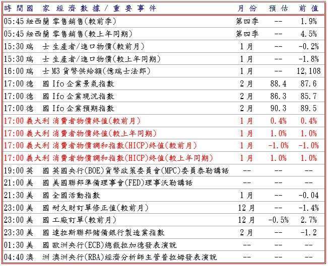 據德國聯邦統計局公布 1 月生產者物價指數 (PPI) 分別較前月與去年同期跌 0.6% 及 3.0% 超過預期,但 S&P 全球編制 2 月 HCOB 初值 PMI 調查,法國服務業與綜合分別升至 49.6 及 49.9,德國製造業、服務業與綜合 PMI 則分別為 50.7、53.4 及 53.1,而且歐元區製造業與綜合分別升至 50.8 及 51.9,製造業去年 10 月以來首次重回擴張區間,提振歐元兌美元至 1.1807 高點。預估今日歐元兌美元支撐於 1.1790-1.1810,阻力於 1.1870-90。