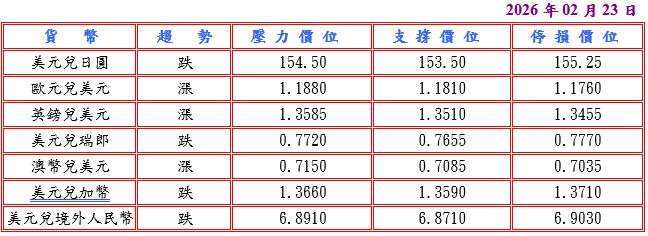 美國 12 月貿易逆差擴大及去年商品貿易逆差創歷史新高,但勞動力市場仍強韌,為美國聯邦準備理事會 (FED) 短期內維持利率不變提供空間,推動美元走強;此外,上週五調查顯示,2 月標準普爾 (S&P) 全球日本製造業採購經理人指數 (PMI) 初值升至 52.8,創 2022 年 5 月以來最強勁增長,但日本 1 月全國核心消費者物價指數 (CPI) 較上年同期漲 2.0%,創兩年來最低增速,恐使日本央行 (BOJ) 關於何時再加息的決策變得複雜,並據日本首相高市早苗重申推行負責任的積極財政政策,承諾打破過度財政撙節,彰顯政府振興經濟的決心,而且日本政府最早於 2 月 25 日向國會提交央行審議委員兩個空缺人選的提名,知情人士透露,候選名單中包含再通貨膨脹論者,令日圓承壓,美元兌日圓觸及 155.64 高點。