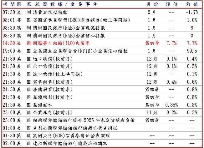 美國 2 月消費者信心指數升至六個月最高,但民眾普遍擔憂勞動力市場及與進口關稅相關的通貨膨脹導致生活成本上升,而且美國財政長貝森特認為即使美國聯邦準備理事會 (FED) 提名人沃什上任後,FED 也不會迅速縮減資產負債表,可能至少耗時一年才能敲定具體行動,令美元受阻;此外,日本首相高市早苗領導的自民黨在週日眾議院選舉中取得三分之二以上席位的歷史性勝利,為其承諾的減稅政策及旨在對抗中國的軍事開支鋪平道路,週一引發日本公債收益率攀升,並據日本政府公布去年 12 月經常帳盈餘為 7,288 億日圓低於預期,而且數據顯示日本 12 月實質薪資較上年年同期跌 0.1%,為 2025 年每月均呈下滑,1 月服務業景氣判斷指數則降至 47.6,打擊日圓下挫,美元兌日圓升至 157.72 高點。