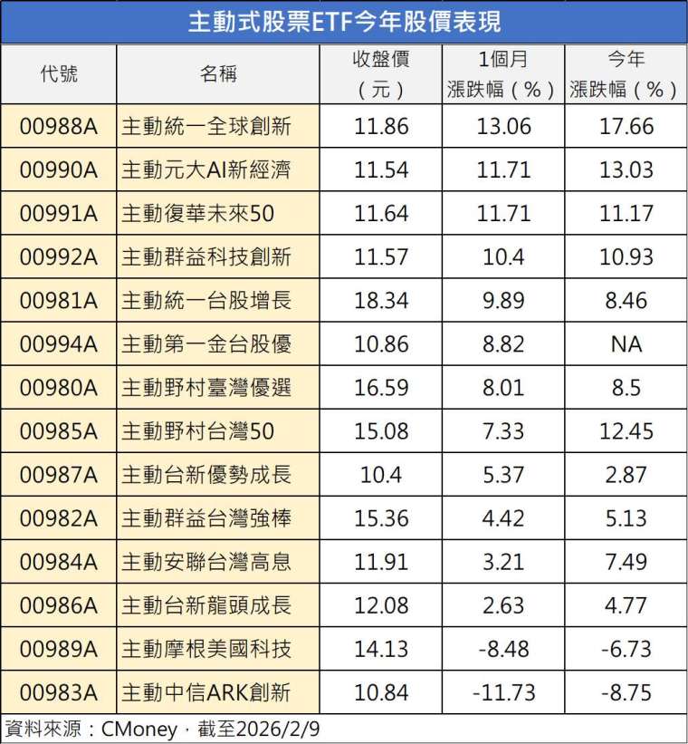 據 CMoney 統計至 2/9,13 檔主動式股票型 ETF 中,有 5 檔今年股價上漲雙位數漲幅,最會漲的是主動統一全球創新 (00988A-TW),累積漲幅 17.66%,其餘四檔漲幅落在 10~13% 不等,可以看出 00988A 績效遙遙領先。