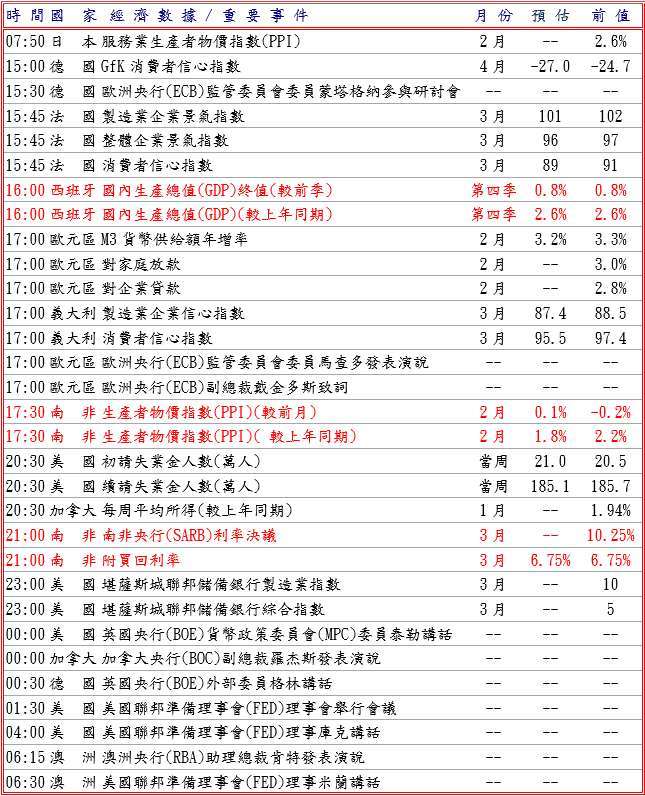 週三英國工業聯盟 (CBI) 調查 3 月零售銷售表現的指標較去年同期降至負 52,創 2020 年 4 月以來最大跌幅,而且英國 2 月 CPI 持平於 3.0% 及服務業通貨膨脹率為 2022 年 3 月以來最低 4.2%,打擊英鎊兌美元自 1.3435 高點下滑,隨著中東戰爭推高物價,英國通貨膨脹率可能大幅攀升,市場預測英國央行 (BOE) 在 4 月會議加息的概率為 67% 及年內至少加息兩次,但白宮稱若德黑蘭不承認被擊敗,川普政府將對其施以更猛烈打擊,推低英鎊兌美元至 1.3355 低點。預估今日英鎊兌美元阻力於 1.3355-75,支撐於 1.3250-70。