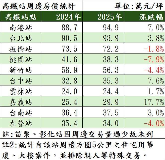 另值得關注的是,各高鐵站中,以桃園、新竹站跌幅最大,其中桃園站從 2024 年的每坪 41.6 萬元,修正至 38.3 萬元,跌幅達 7.9%,為全台高鐵站之最;新竹站也從每坪 58.9 萬元下跌至 56.3 萬元,跌幅 4.4%,跌幅僅次於桃園。