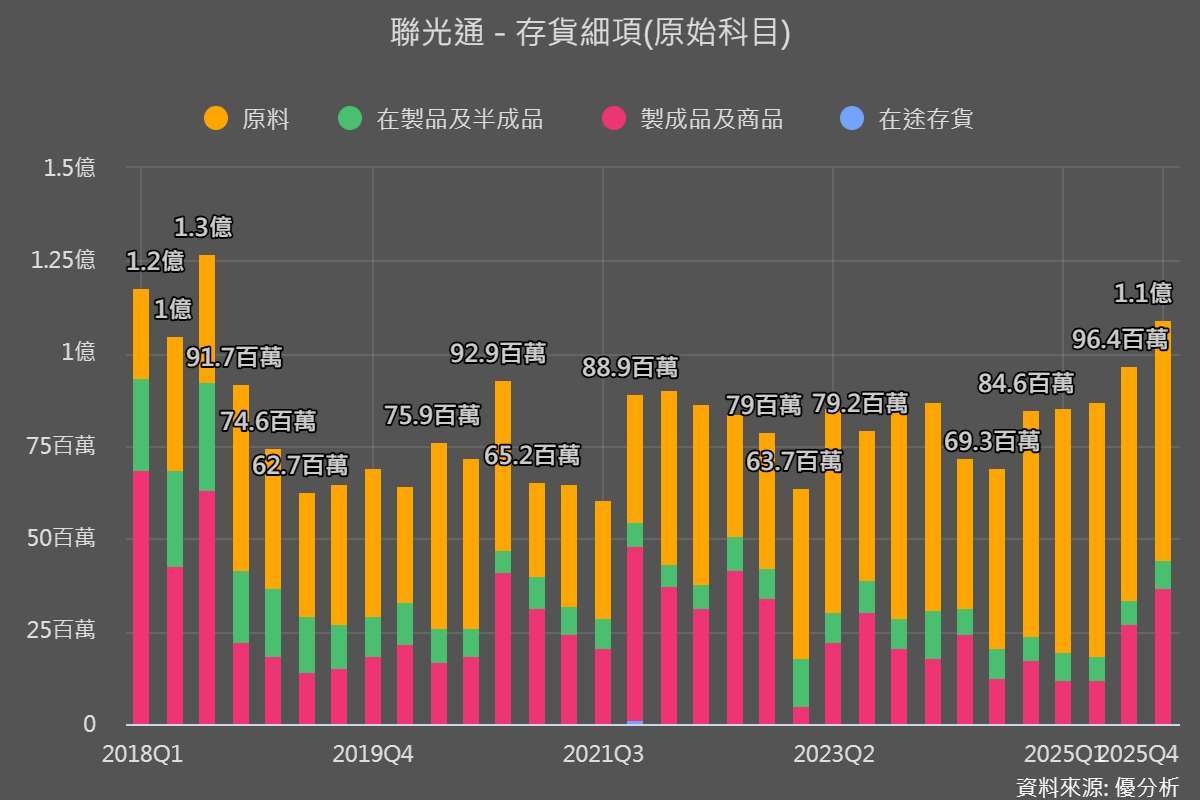 從 2018 年以來,聯光通(4903-TW) 的存貨循環歷經高檔下修與整理期;2024 年後,整體存貨水位開始穩定墊高,而 2025Q4 最新存貨總額明顯走高,循環持續向上。對一家以工程與專案建置為主的公司而言,存貨往上通常對應的是訂單動能與專案進度推進。