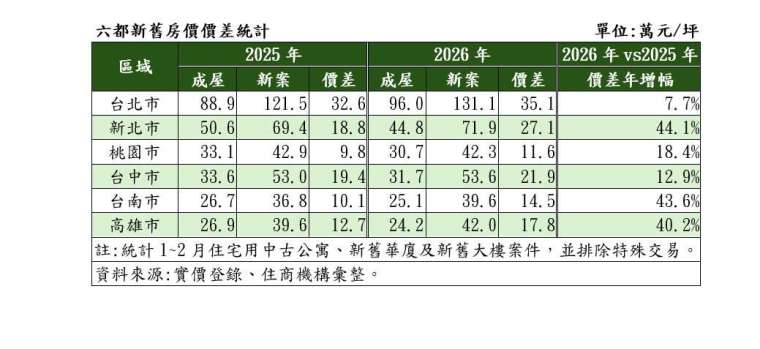 全台房市買氣冷凍,但預售案價格聞風不動,但也令新舊屋價差持續擴大。房仲統計實價資料,全台六都 2025 年 1-2 月新舊案每坪單價價差,除台北市之外,普遍價差僅約 10 萬元上下,但至今年六都價差更深,其中新北市價差更成長 44.1% 來到 27.1 萬元。