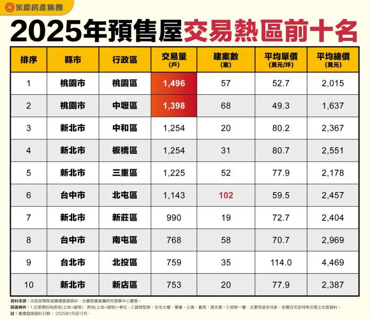房市凍,但預售仍以桃園最熱,房仲業者彙整 2025 年全台各行政區預售住宅銷售情形,桃園市桃園區以全年累積 1496 戶的交易量位居第一,顯示區域房市發展極具潛力。觀察上榜的行政區,可以發現多集中在北台灣,其中新北市共有 5 個行政區上榜,成為上榜最多行政區的縣市。