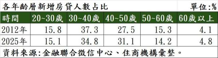 觀察數據,自 2012- 2025 年的新增房貸年齡層占比,長年為購屋主力的 30 至 40 歲族群,占比逐漸萎縮,從 2012 年的 37.3%,一路下滑至 2025 年的 34.8%;反觀 40 至 50 歲的中年族群,占比卻從 27.5% 攀升至 31.1%,創下歷史新高。