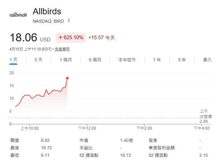 截稿前,Allbirds(BIRD-US) 股價上漲 625.10%,每股暫報 18.06 美元。